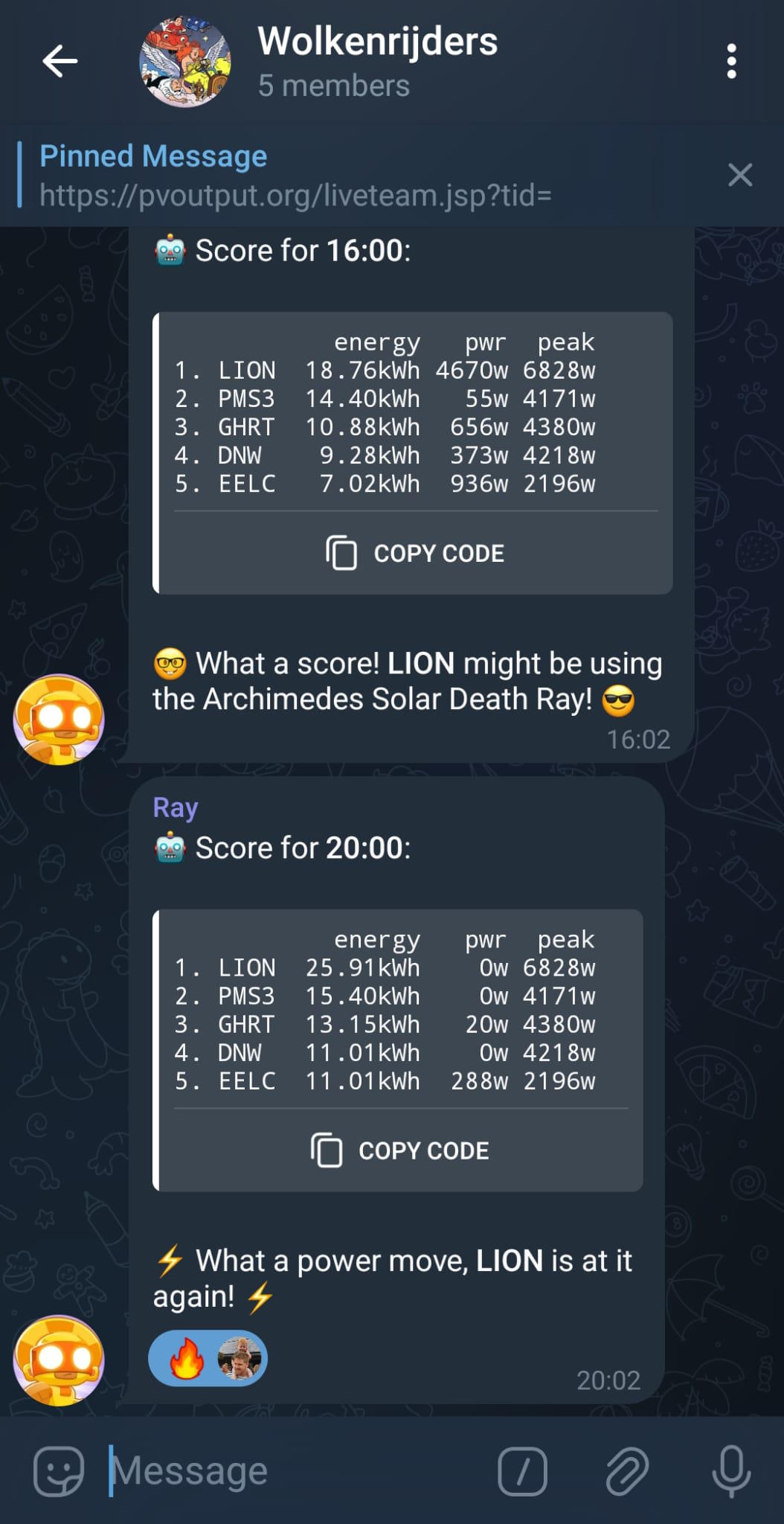 Last year, I got some Zonneplan solar panels. My colleagues and I got hooked on comparing stats, so we decided to upload our solar panel stats to PVOutput and build a Telegram bot to keep score: