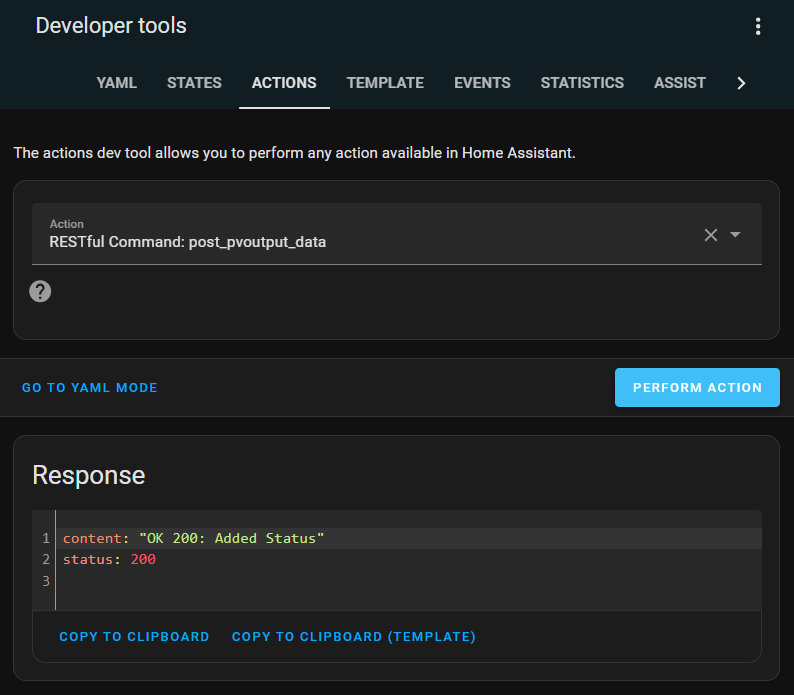 - Command: If you want to trigger the command, you can execute it from the UI as well. Navigate to Developer Tools > Actions > RESTful Command: post_pvoutput_data and hit the Perform Action button.