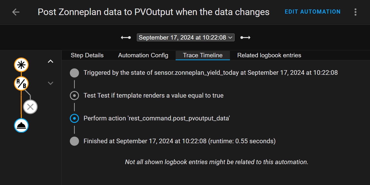- Automation traces: trace every run with a nice UI, go to Settings > Automations & Scenes > Post Zonneplan data to PVOutput when the data changes > Traces (top right corner):